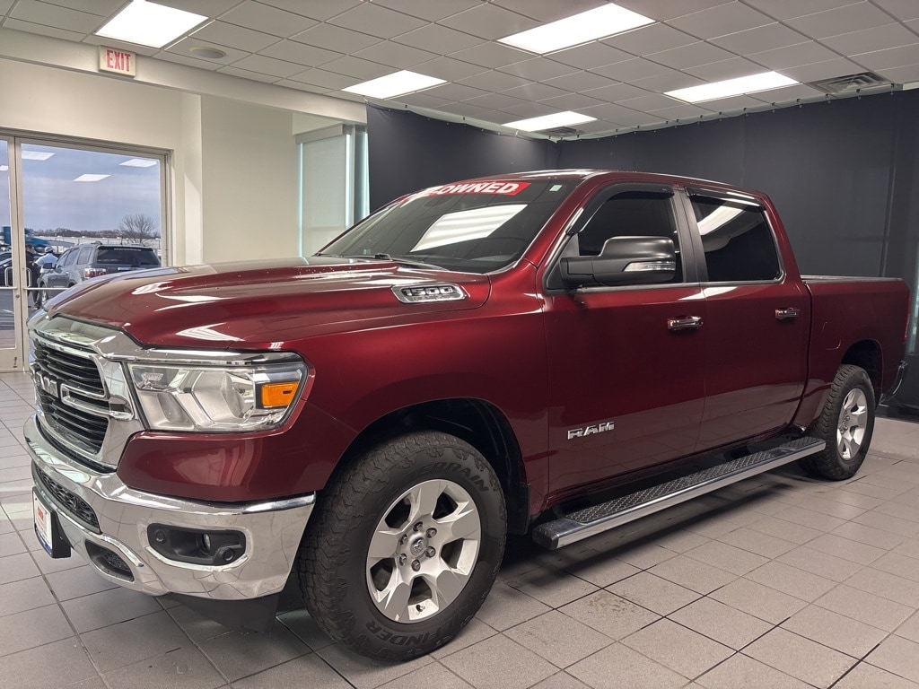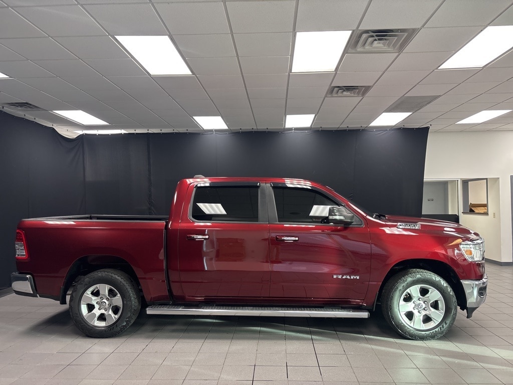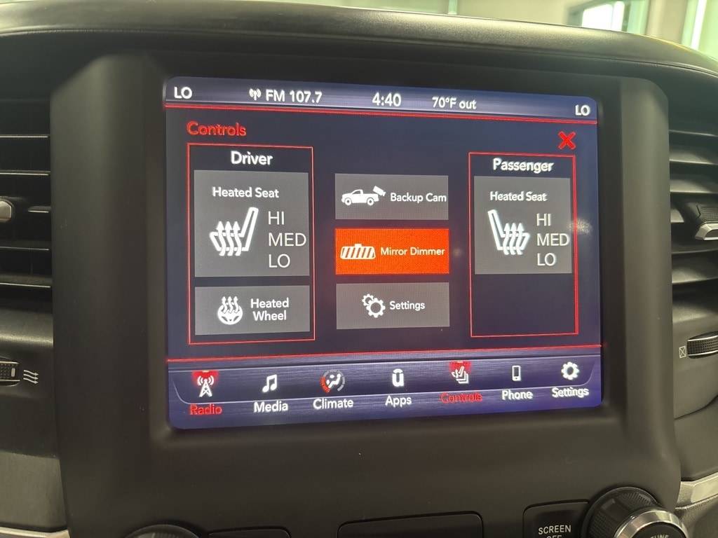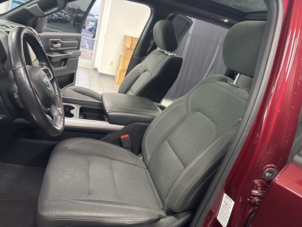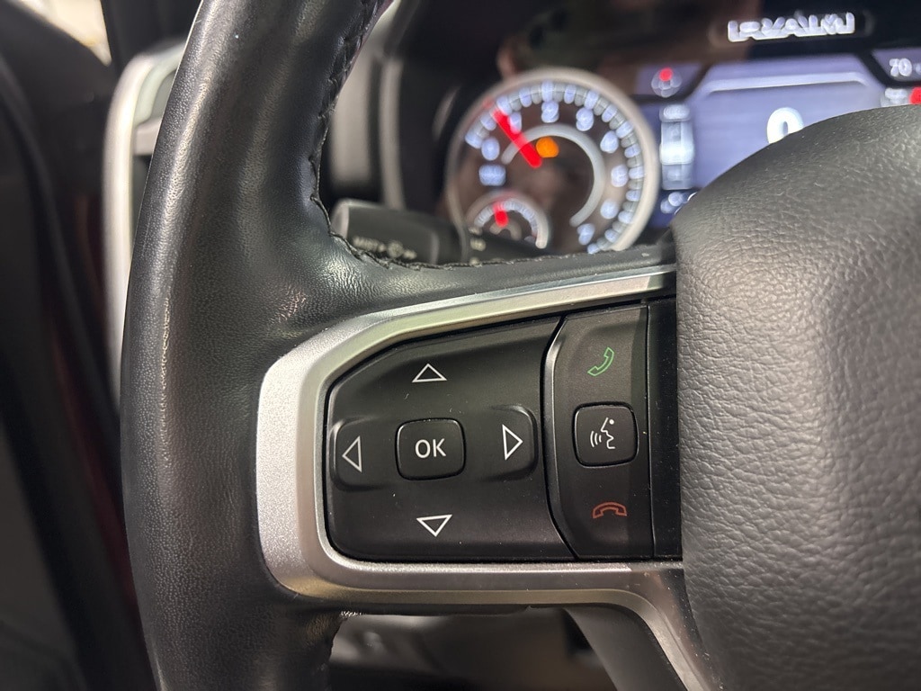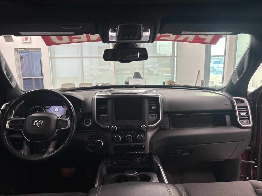 Clean CARFAX. Delmonico Red Pearlcoat Big Horn/Lone Star 4WD 8-Speed Automatic HEMI 5.7L V8 Multi Displacement VVT 1-Year SiriusXM Radio Service, 2 USB Full Function/Charge Only Media Hub, 3 Rear Seat Head Restraints, 3.21 Rear Axle Ratio, 4 Way Front Headrests, 4-Wheel Disc Brakes, 48V Belt Starter Generator, 6 Speakers, 8.4" Touchscreen Display, 9 Amplified Speakers w/Subwoofer, ABS brakes, Air Conditioning, Air Conditioning ATC w/Dual Zone Control, Alloy wheels, AM/FM radio, Apple CarPlay, Auto-Dimming Exterior Driver Mirror, Auto-Dimming Rear-View Mirror, Big Horn IP Badge, Big Horn Non-BSG Level 2 Group w/Media Hub (DISC), Brake assist, Bumpers: chrome, Class IV Receiver Hitch, Cloth Bench Seat, Cluster 7.0" TFT Color Display, Compass, Dampened Tailgate, Delay-off headlights, Dome Dual LED Reading Lamp, Driver door bin, Dual front impact airbags, Dual front side impact airbags, Dual-Pane Panoramic Sunroof, Electronic Stability Control, Exterior Mirrors Courtesy Lamps, Exterior Mirrors w/Supplemental Signals, Foam Bottle Insert (Door Trim Panel), For More Info, Call 800-643-2112, Front & Rear Rubber Floor Mats, Front anti-roll bar, Front Center Armrest w/Storage, Front fog lights, Front reading lights, Front Seat Back Map Pockets, Front wheel independent suspension, Fully automatic headlights, Glove Box Lamp, Google Android Auto, GPS Antenna Input, Heated door mirrors, Heated Front Seats, Heated Steering Wheel, Illuminated entry, Integrated Center Stack Radio, Leather steering wheel, Low tire pressure warning, Occupant sensing airbag, Outside temperature display, Overhead airbag, Overhead console, Overhead LED Lamps, Panic alarm, ParkSense Front/Rear Park Assist w/Stop, ParkView Rear Back-Up Camera, Passenger door bin, Passenger vanity mirror, Power 4-Way Driver Lumbar Adjust, Power 8-Way Driver Seat, Power Adjustable Pedals, Power door mirrors, Power Heated Fold Away Mirrors, Power steering, Power windows, Power-Folding Mirrors, Premium Overhead Console, Quick Order Package 25Z Big Horn/Lone Star, Radio data system, Radio: Uconnect 3 w/5" Display, Radio: Uconnect 4 w/8.4" Display, Rear 60/40 Folding Seat, Rear anti-roll bar, Rear Dome w/On/Off Switch Lamp, Rear Power Sliding Window, Rear seat center armrest, Rear step bumper, Rear Window Defroster, Remote keyless entry, Remote Start System, Security Alarm, Single Disc Remote CD Player, SiriusXM Satellite Radio, Speed control, Split folding rear seat, Steering Wheel Mounted Audio Controls, Sun Visors w/Illuminated Vanity Mirrors, Tachometer, Telescoping steering wheel, Tilt steering wheel, Traction control, Trip computer, Universal Garage Door Opener, Variably intermittent wipers, Voltmeter, Wheels: 18" x 8".